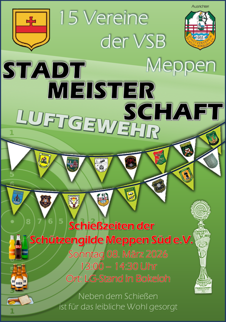 Nächster Schießtermin: Übungsschießen Luftgewehr Mittwoch 04.März 2026 ab 18:30 Vereinsjugend ab 20:00 Schützen und Schützinnen Ü18 in unserer Schützenhalle (Heideweg)